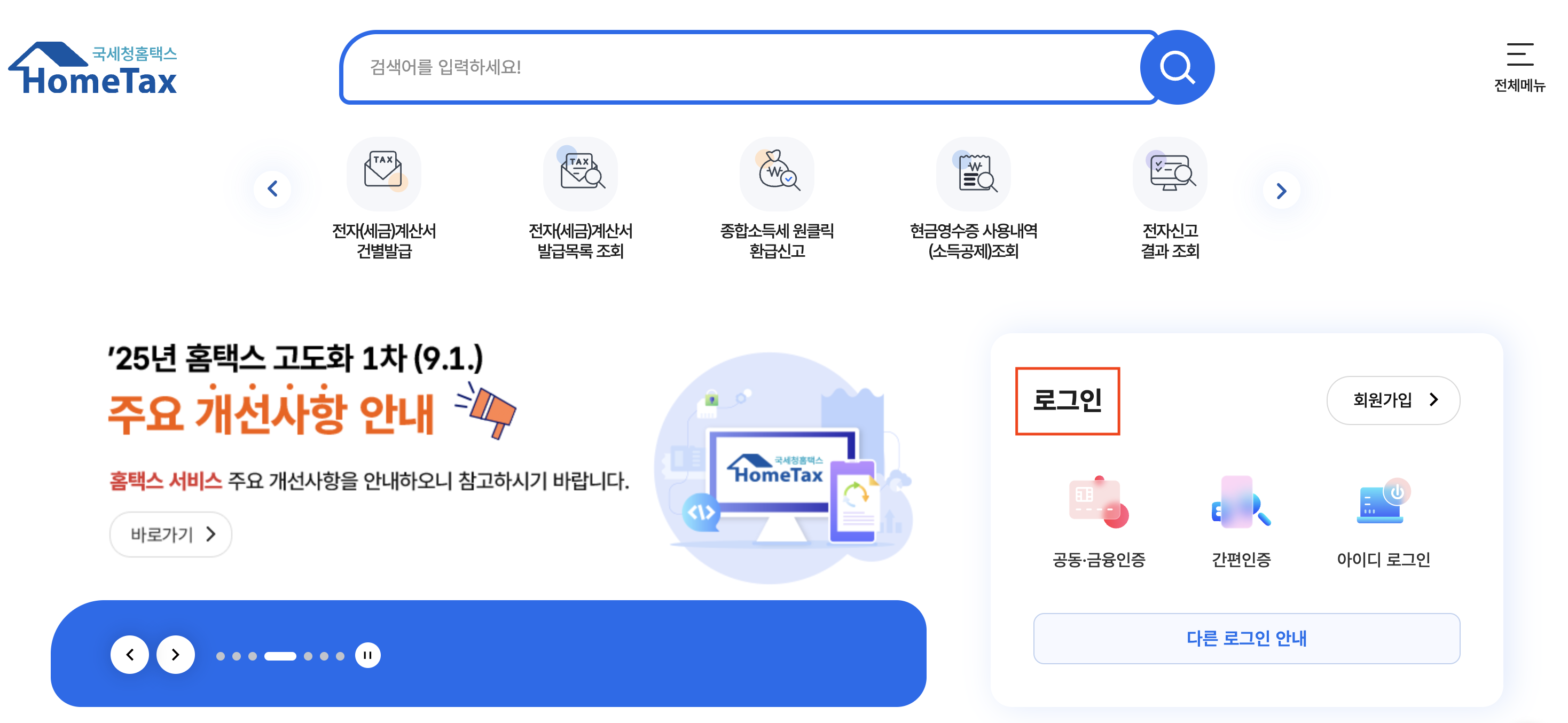 홈택스(www.hometax.go.kr) 접속 → 공동인증서, 간편인증 등으로 로그인 - 메뉴 이동